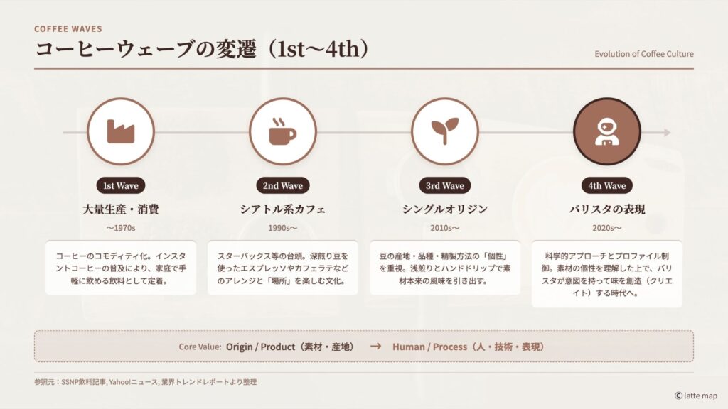コーヒーの歴史は、エチオピアの山中で山羊飼いカルディが発見したという伝説から始まります。中東で「知恵の飲み物」として広まり、ヨーロッパを経て世界中へ。19世紀の大量生産・消費(ファーストウェーブ)、20世紀後半のスターバックスに代表される品質重視(セカンドウェーブ)、そして2000年代以降、ワインのようにテロワール(産地や個性など)を重んじる「サードウェーブ」へと進化してきました。そして現在、トレンドは「フォースウェーブ」へと進化しています。サードウェーブが「素材そのもの」に焦点を当てていたのに対し、フォースウェーブではバリスタや焙煎士という「人」の介在価値が最大化されています。
